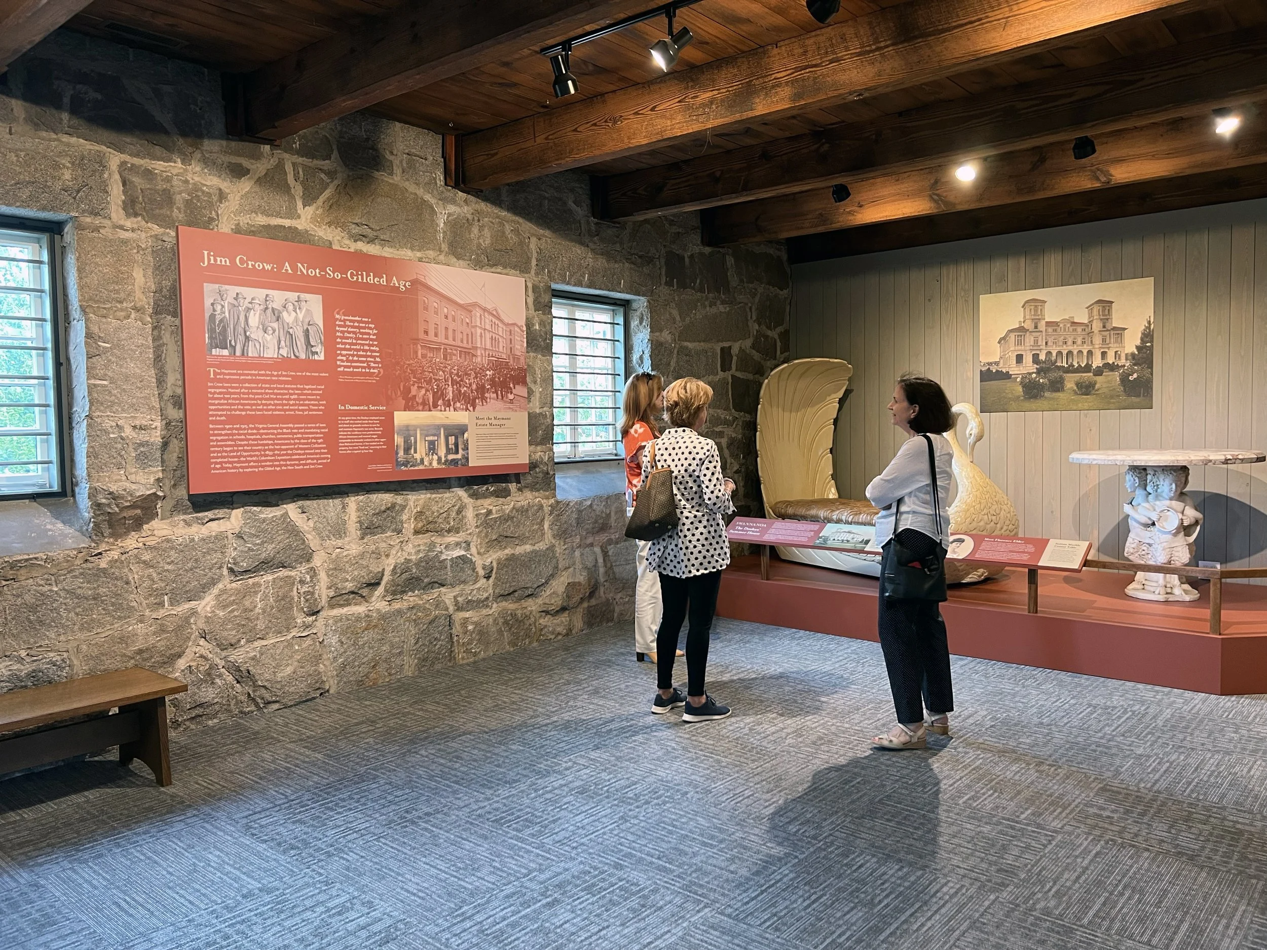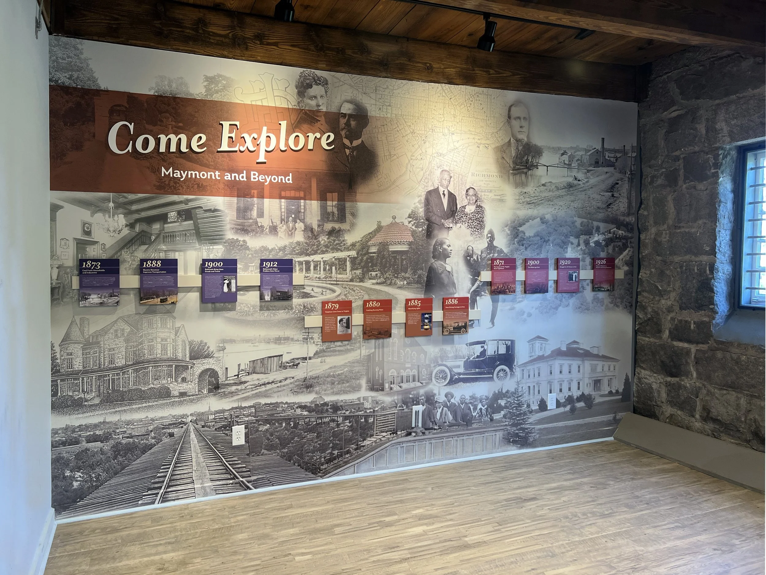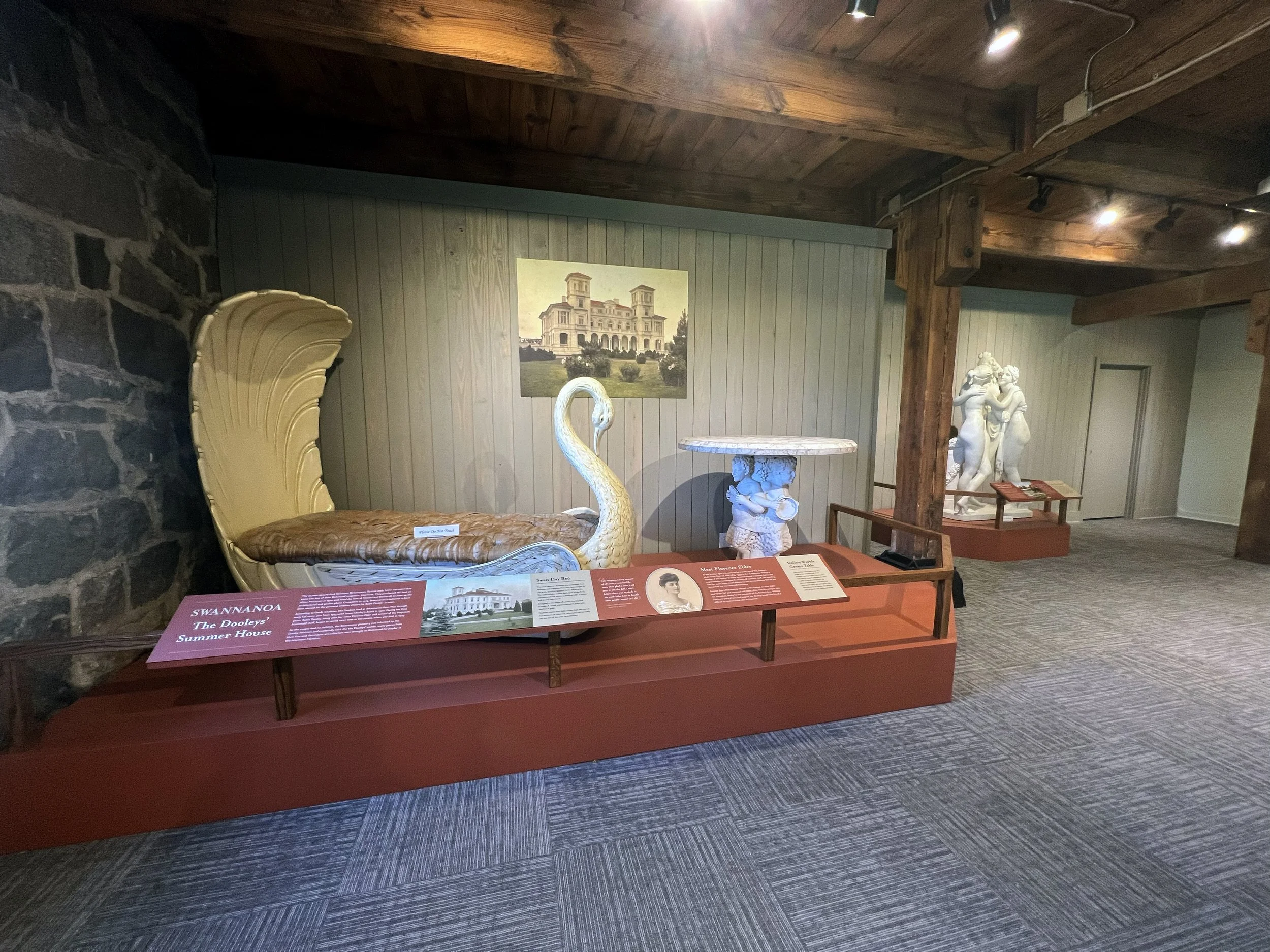 The program is organized into two distinct yet complementary areas. On the classroom side, large-scale, color-coded timeline wall graphic immerses students in Maymont’s history through layered imagery and thematic panels that encourage exploration and discussion. Interactive timeline components and adaptable furnishings allow the space to shift easily between structured lessons and open engagement. On the visitor center exhibit side, bold red interpretive panels and the dramatic display of the iconic swan bed create a focused, object-centered experience that highlights the estate’s Gilded Age legacy. Together, the two environments activate the historic barn with contemporary storytelling while respecting its architectural character.