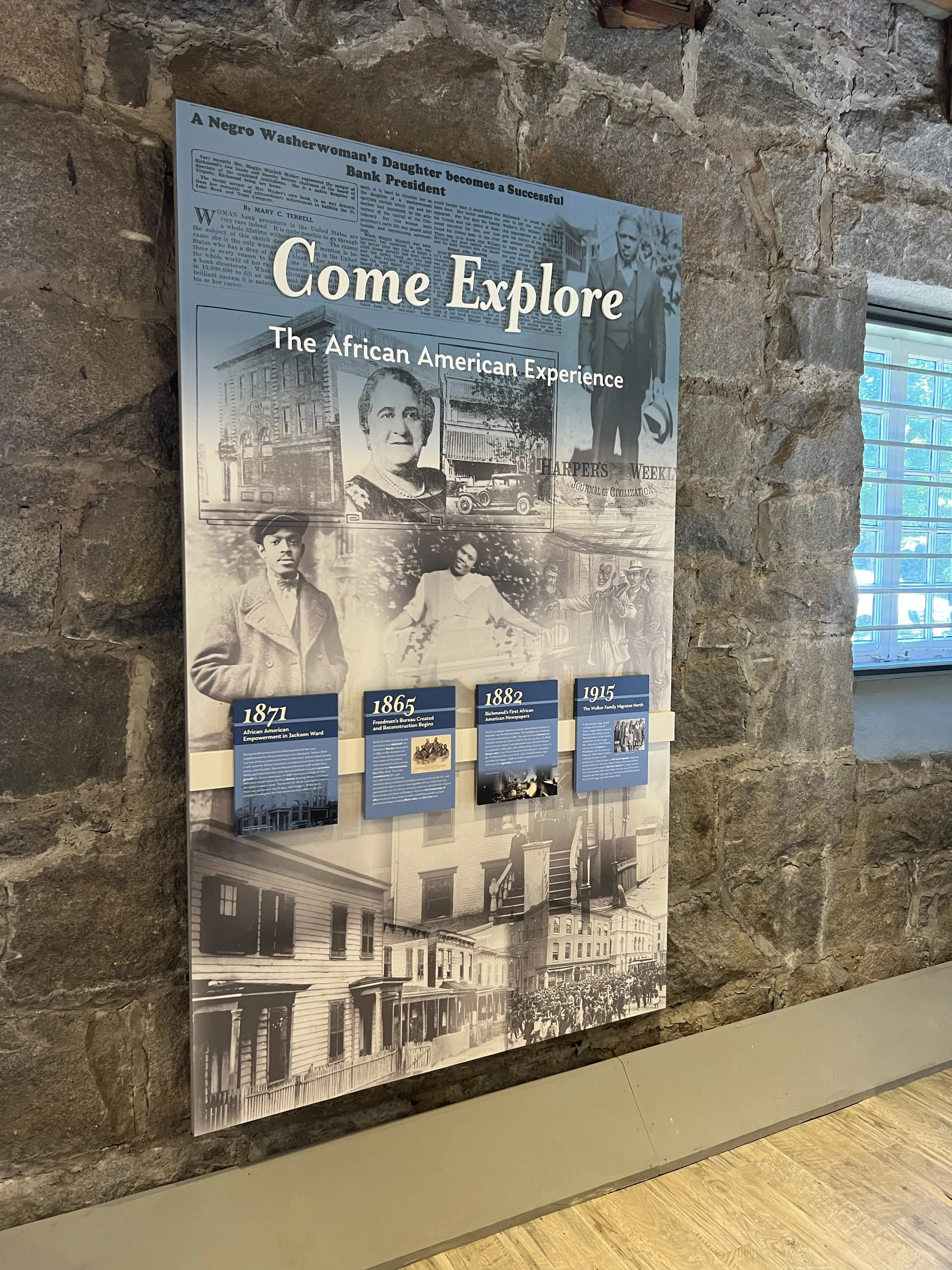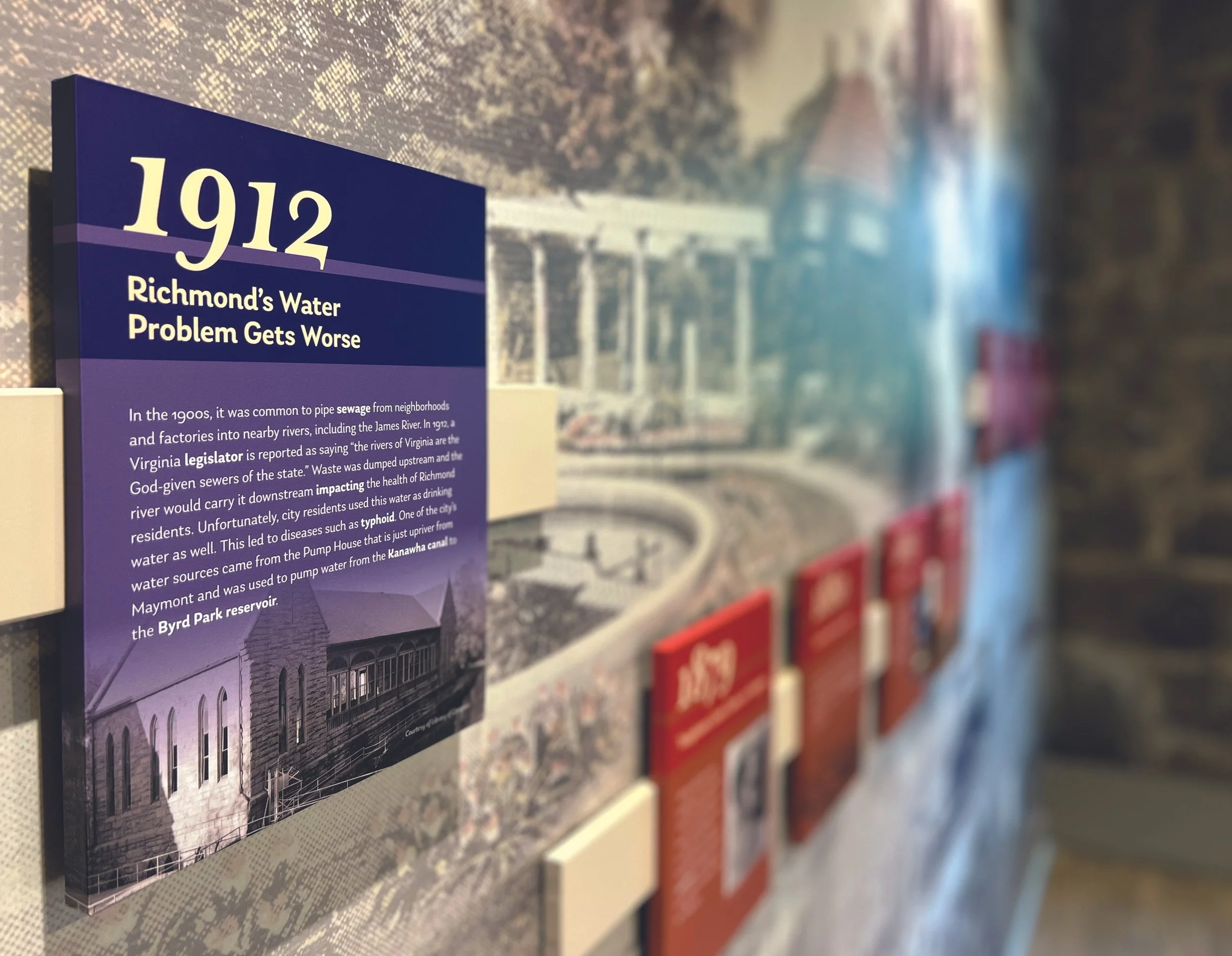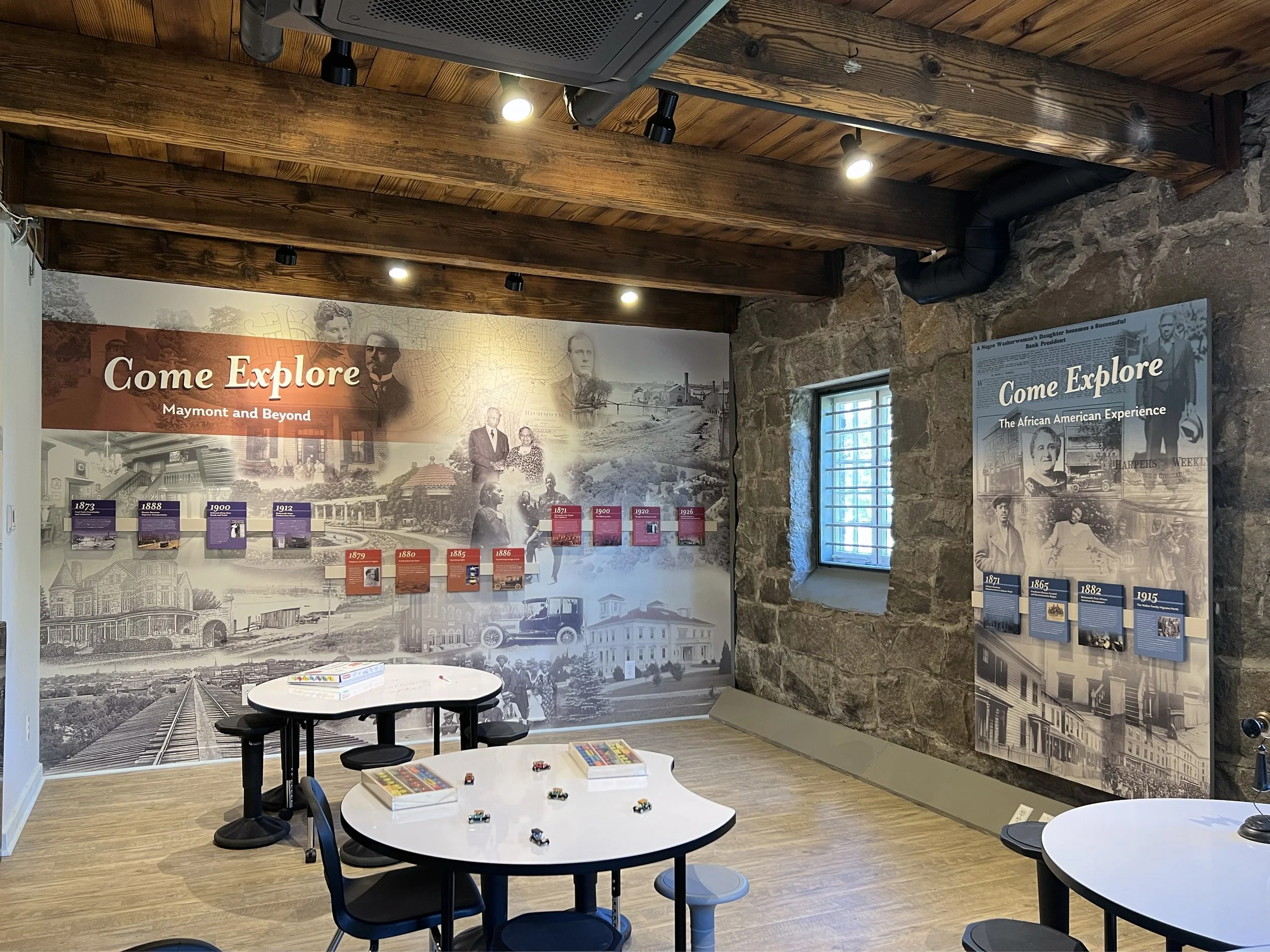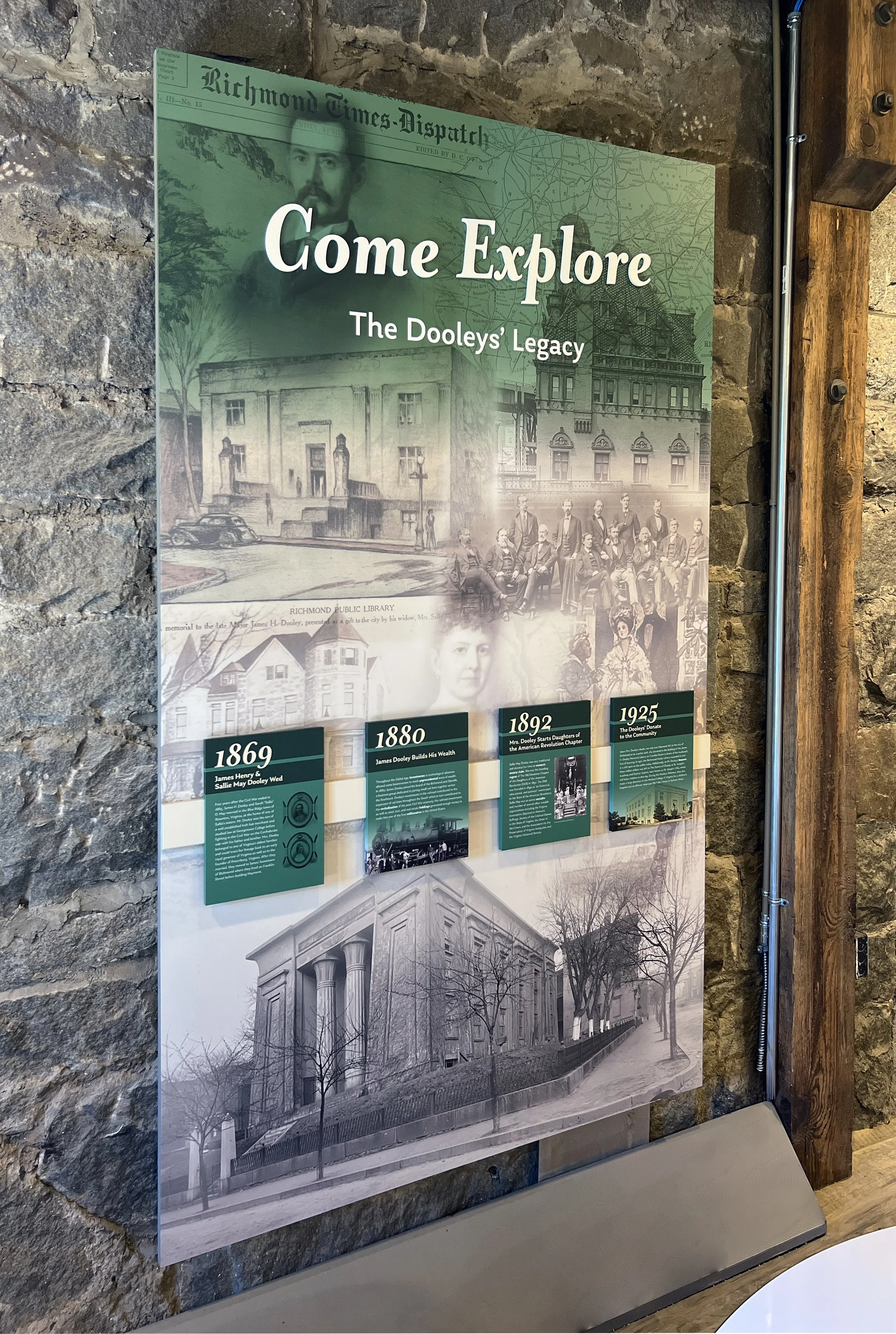 The program is organized into two distinct yet complementary areas. On the classroom side, large-scale, color-coded timeline wall graphic immerses students in Maymont’s history through layered imagery and thematic panels that encourage exploration and discussion. Interactive timeline components and adaptable furnishings allow the space to shift easily between structured lessons and open engagement. On the visitor center exhibit side, bold red interpretive panels and the dramatic display of the iconic swan bed create a focused, object-centered experience that highlights the estate’s Gilded Age legacy. Together, the two environments activate the historic barn with contemporary storytelling while respecting its architectural character.
