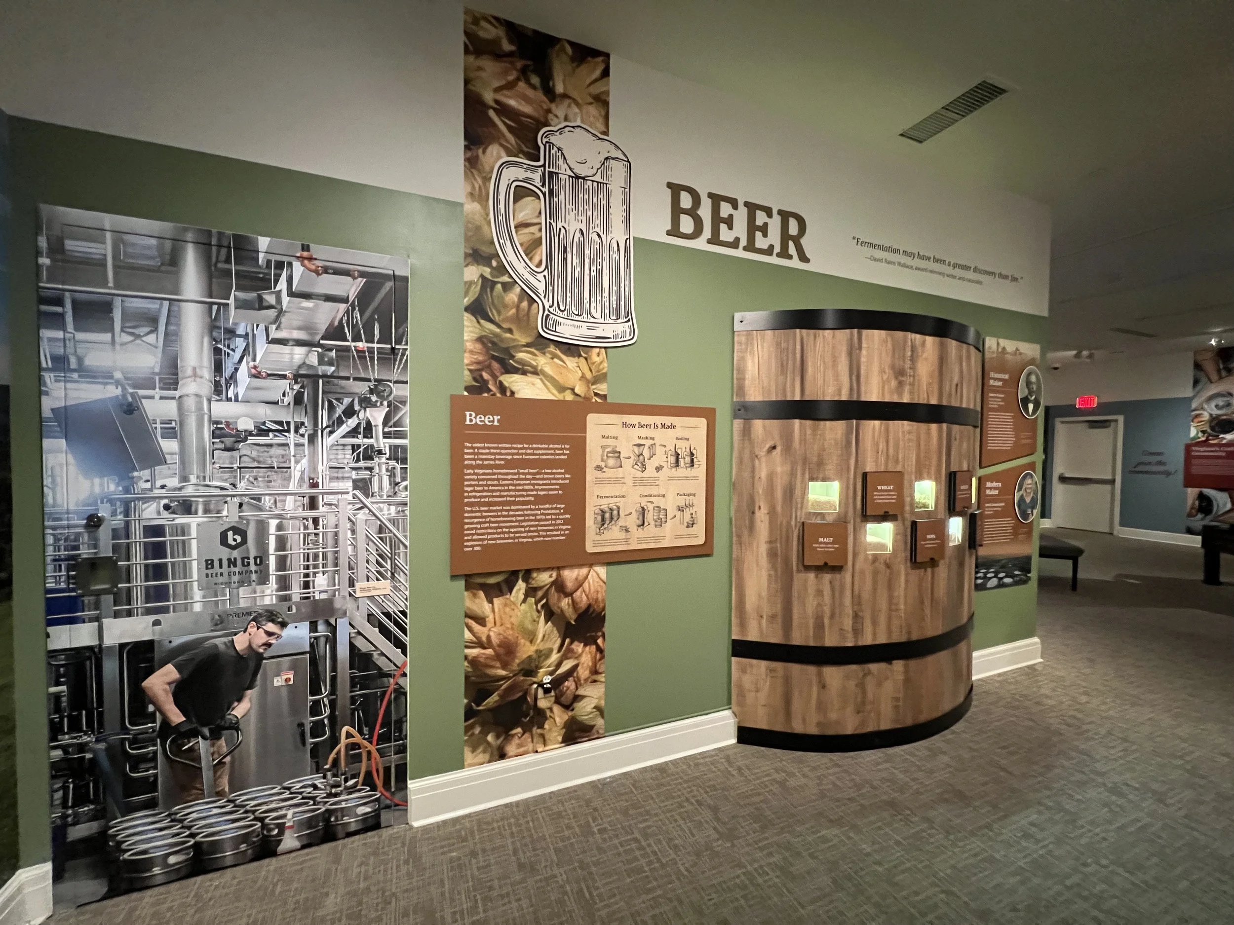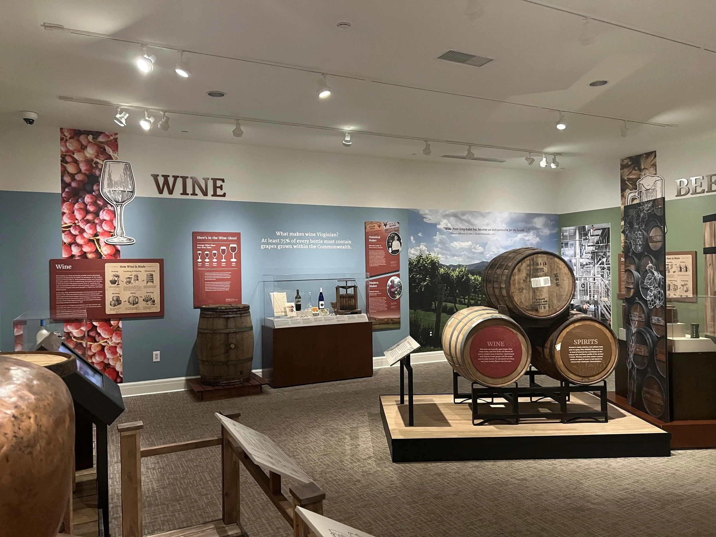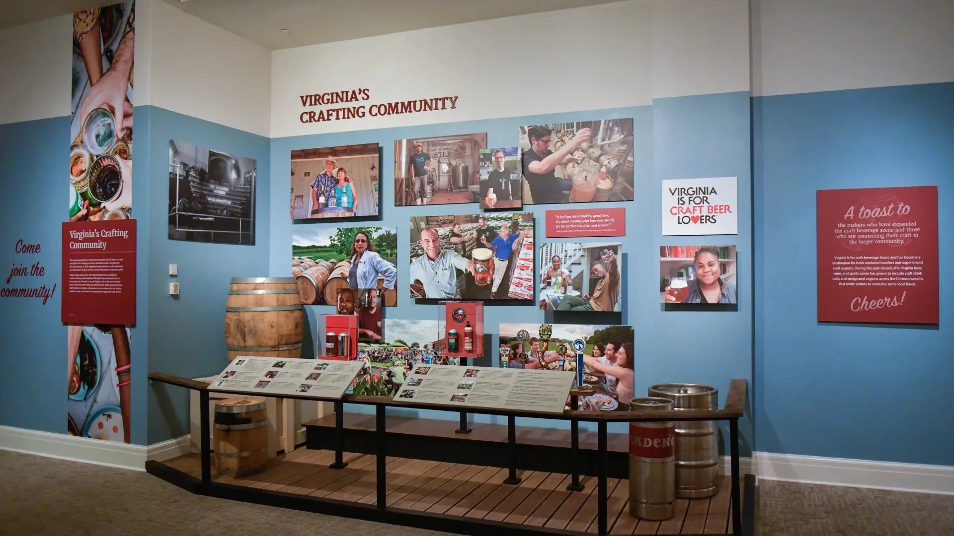 The exhibition design is object-rich and visually immersive, using artifacts, large-scale graphics, and layered interpretation to guide visitors through a chronological and thematic journey. Historic bottles, tools, packaging, and drinking vessels are paired with contemporary imagery and stories to highlight innovation, regulation, and cultural change over time. Warm materials, period-inspired graphics, and carefully focused lighting create an inviting atmosphere that evokes taverns, workshops, and modern tasting rooms, while clear interpretive hierarchies support an engaging, accessible visitor experience from early Virginia to the present-day craft scene.