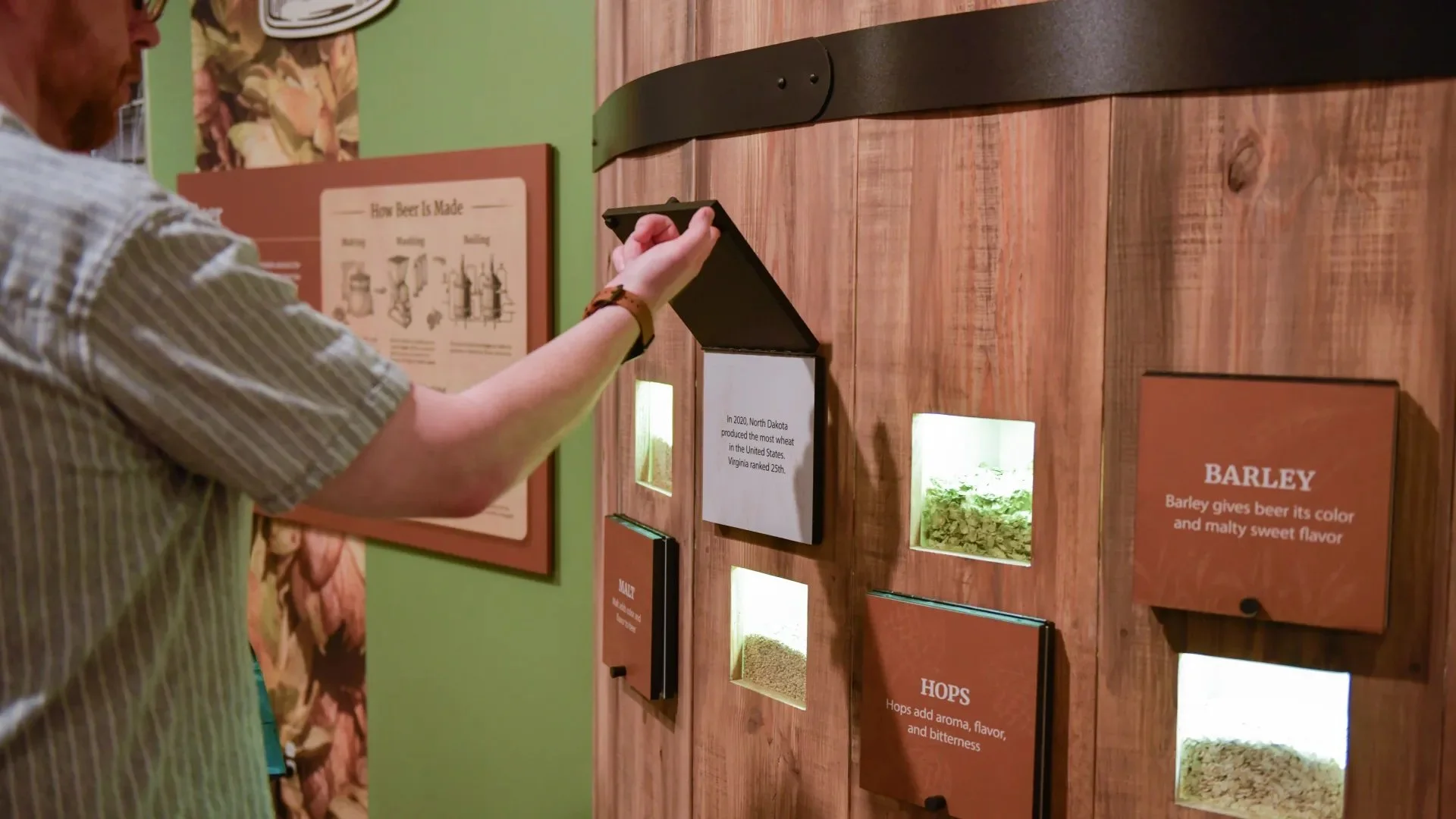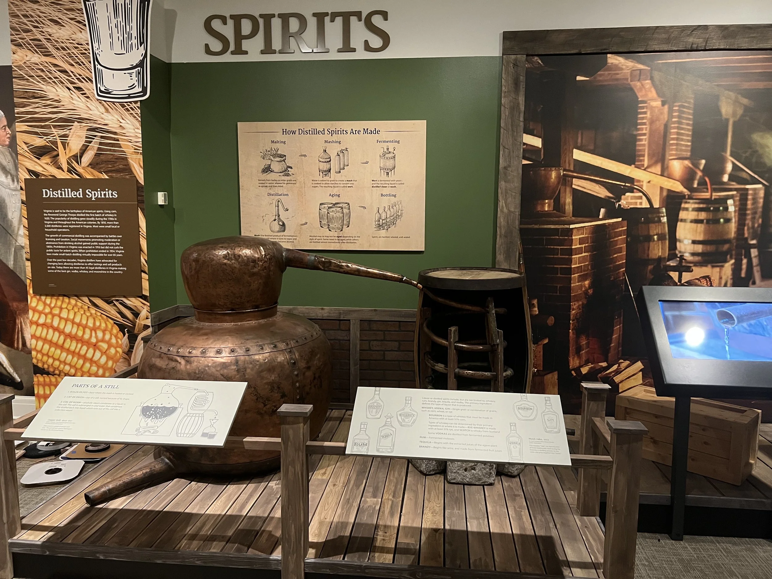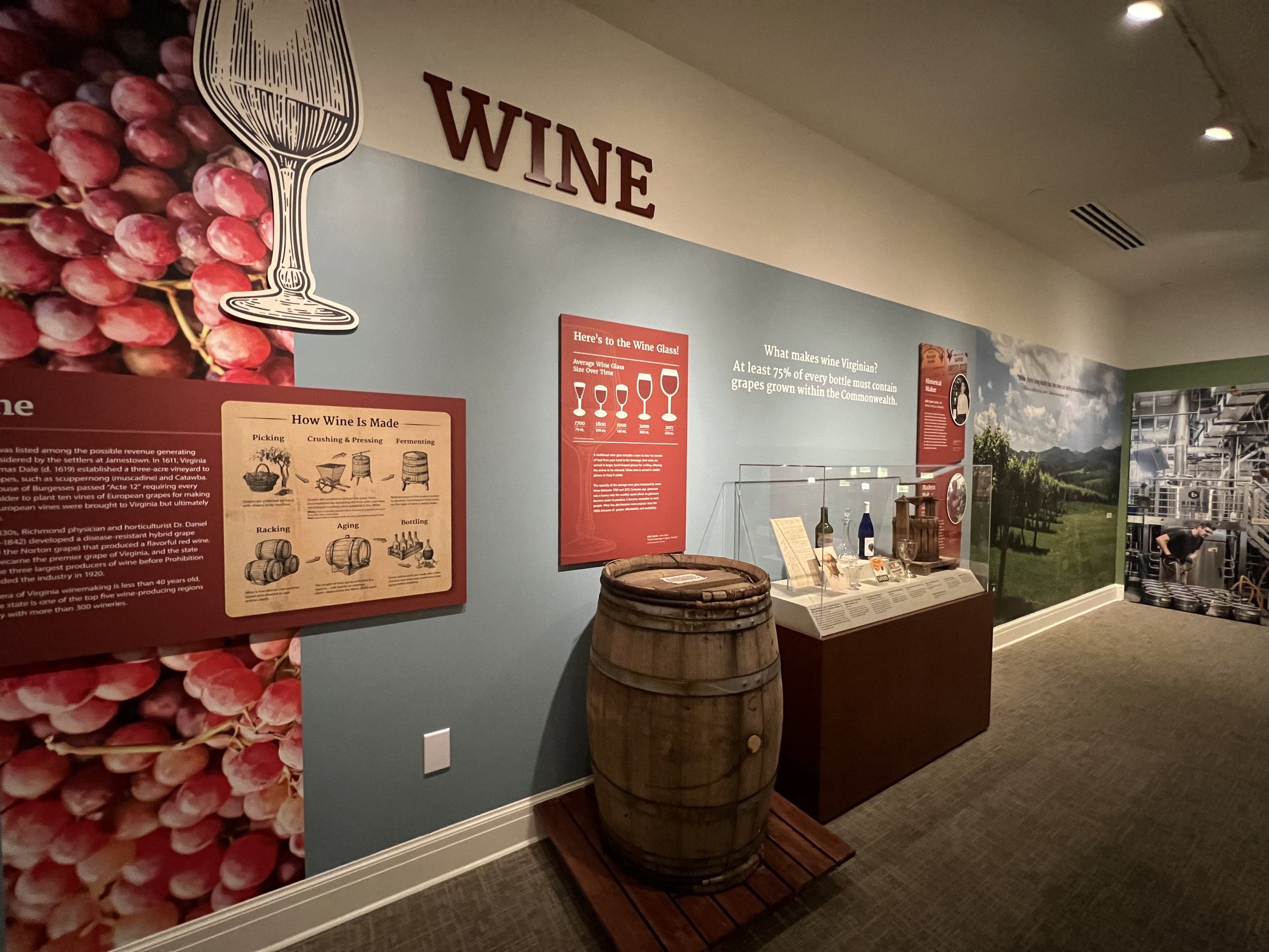 The exhibition design is object-rich and visually immersive, using artifacts, large-scale graphics, and layered interpretation to guide visitors through a chronological and thematic journey. Historic bottles, tools, packaging, and drinking vessels are paired with contemporary imagery and stories to highlight innovation, regulation, and cultural change over time. Warm materials, period-inspired graphics, and carefully focused lighting create an inviting atmosphere that evokes taverns, workshops, and modern tasting rooms, while clear interpretive hierarchies support an engaging, accessible visitor experience from early Virginia to the present-day craft scene.