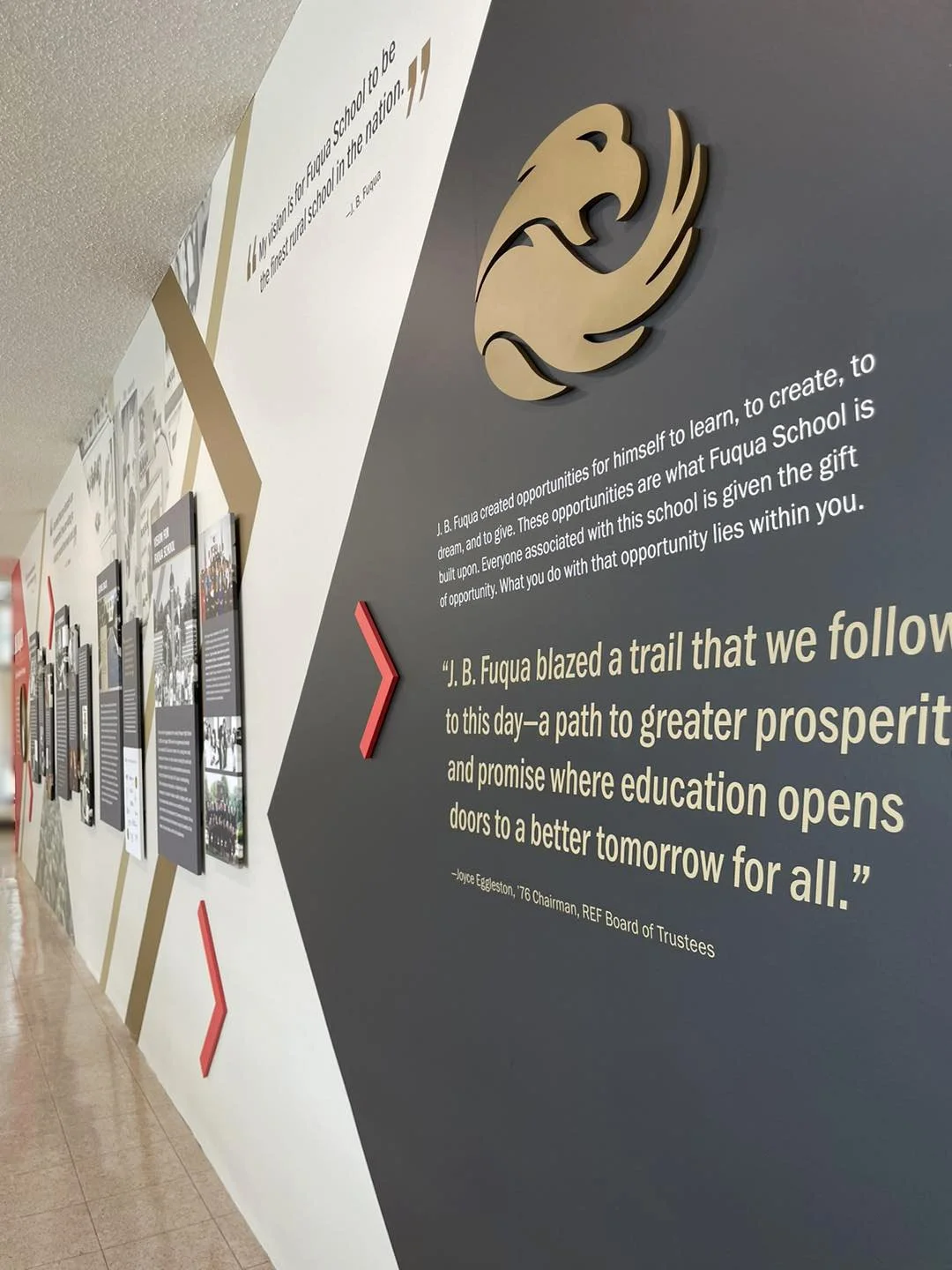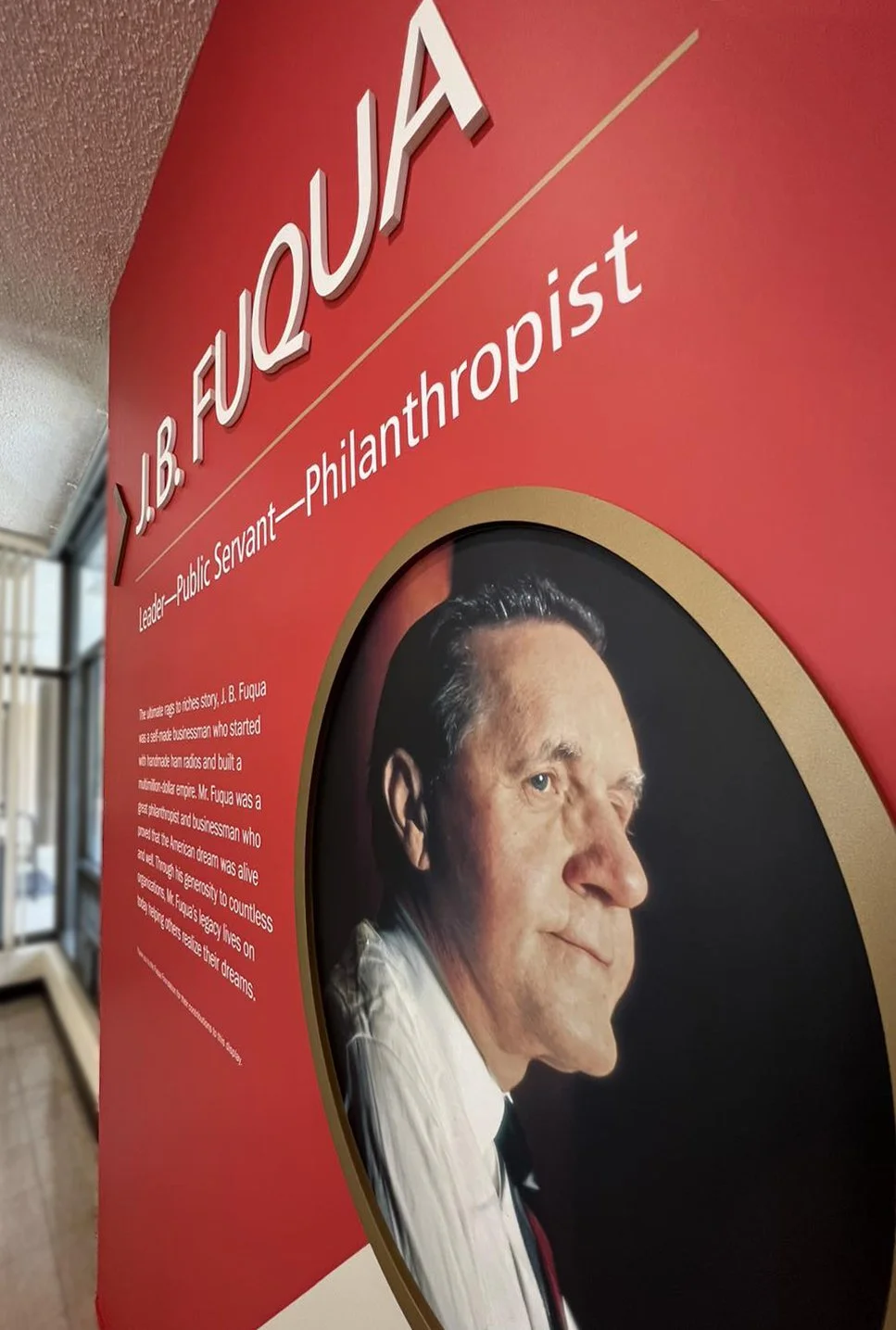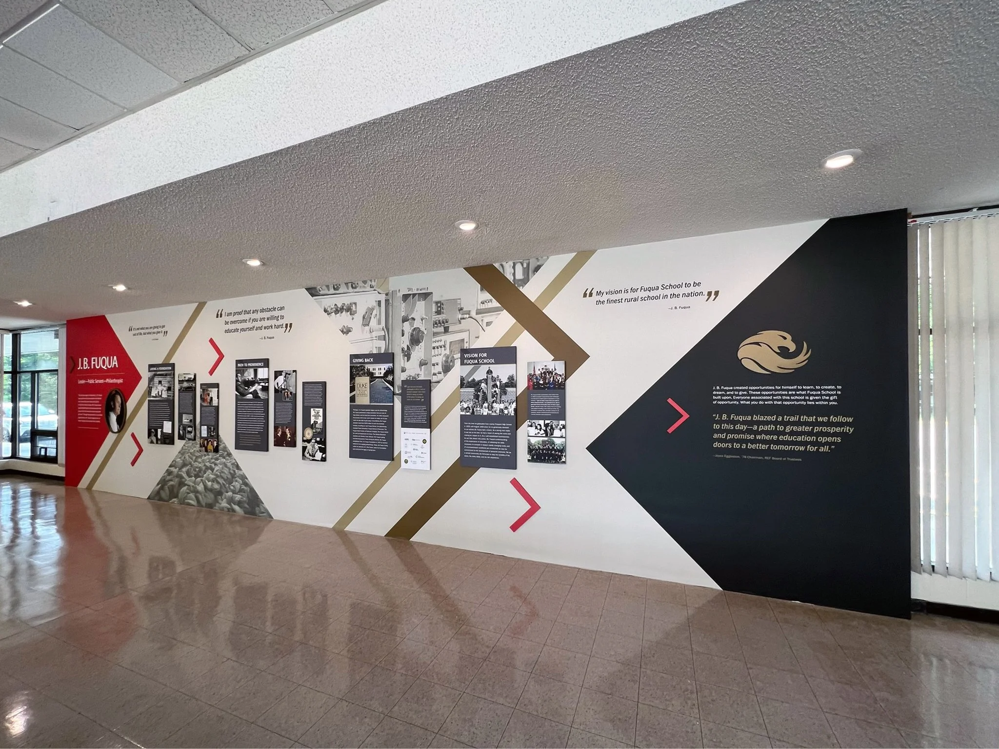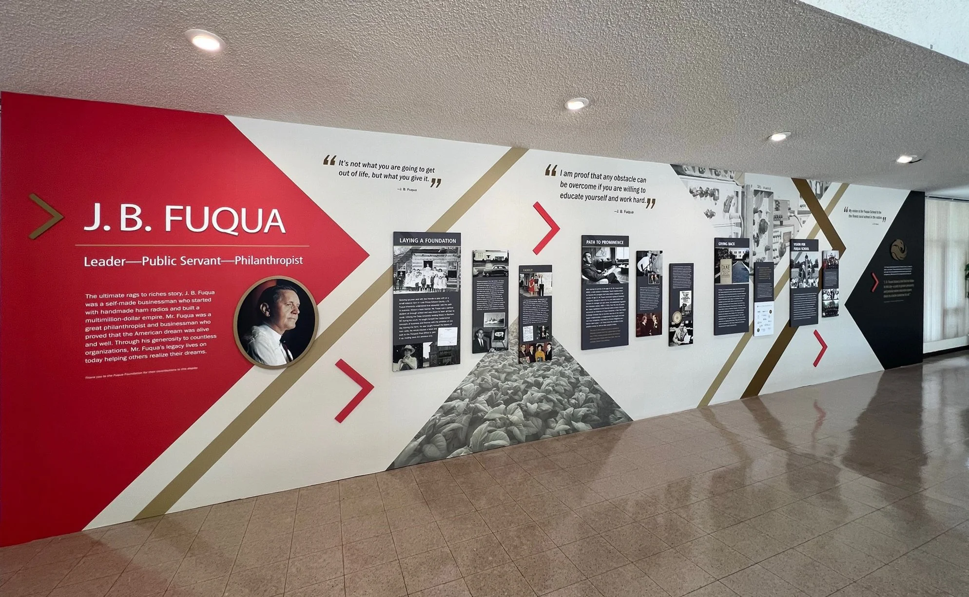 The exhibit wall is organized as a linear narrative that guides viewers through J.B. Fuqua’s life, values, and lasting impact, using bold graphic forms and directional motifs to suggest momentum and progress. Large angular color fields and arrow elements create a visual rhythm across the 45-foot wall, while layered historical photographs, quotations, and concise interpretive panels provide depth and accessibility. A restrained palette of red, black, white, and metallic gold reinforces Fuqua’s brand identity and sense of gravitas, while dimensional elements and large-scale imagery add presence within the shared space. The result is an immersive, museum-quality installation that balances storytelling with architectural clarity, engaging viewers at both a distance and up close.