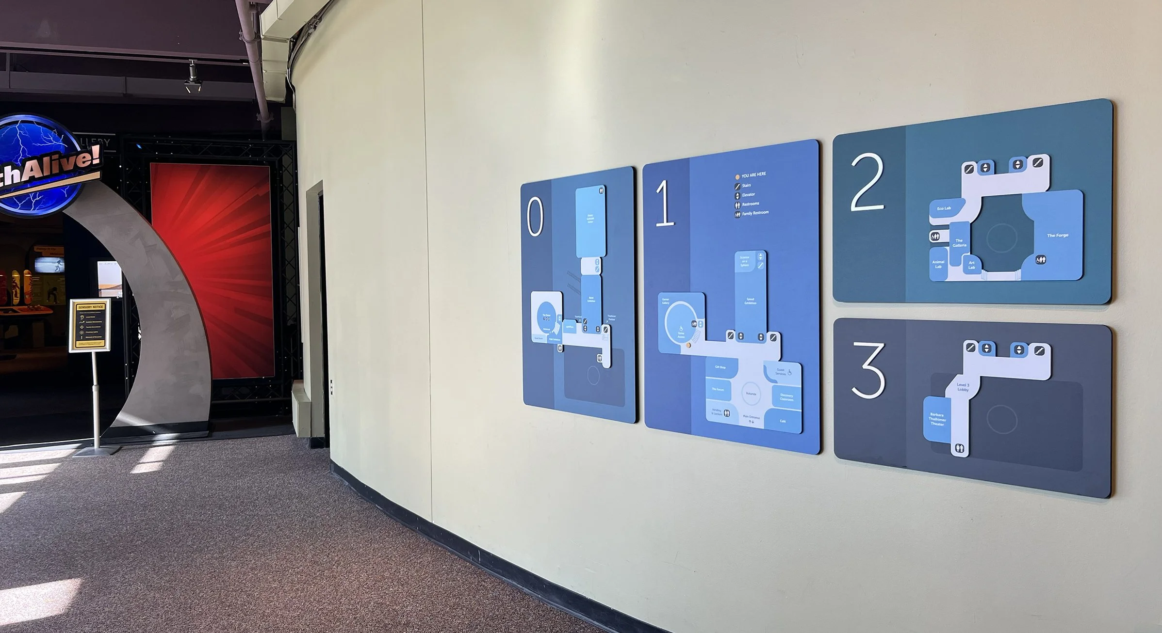 Explorers Studio partnered with the Science Museum of Virginia to design a comprehensive interior wayfinding system centered on first-time visitors and discovery. The goal was to help guests confidently move through the museum’s interconnected spaces while clearly highlighting exhibitions and key destinations along the way. Our work addressed complex circulation patterns, clarified pathways, resolved challenging decision points, and elevated the overall guest experience through a cohesive, intuitive signage system. In collaboration with Museum staff, we developed design and production-ready files and supported coordination with a fabricator to shows the vision through implementation.