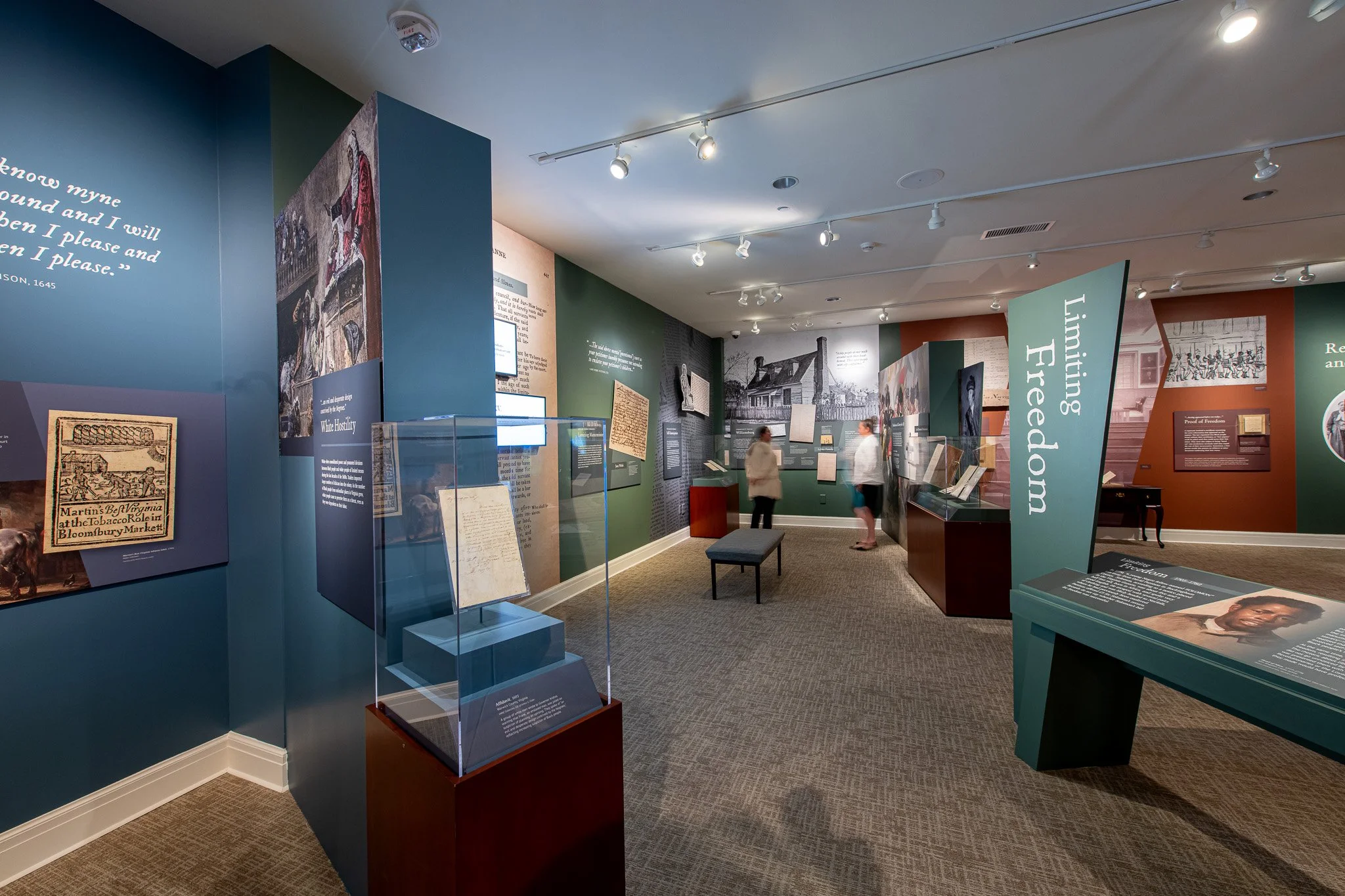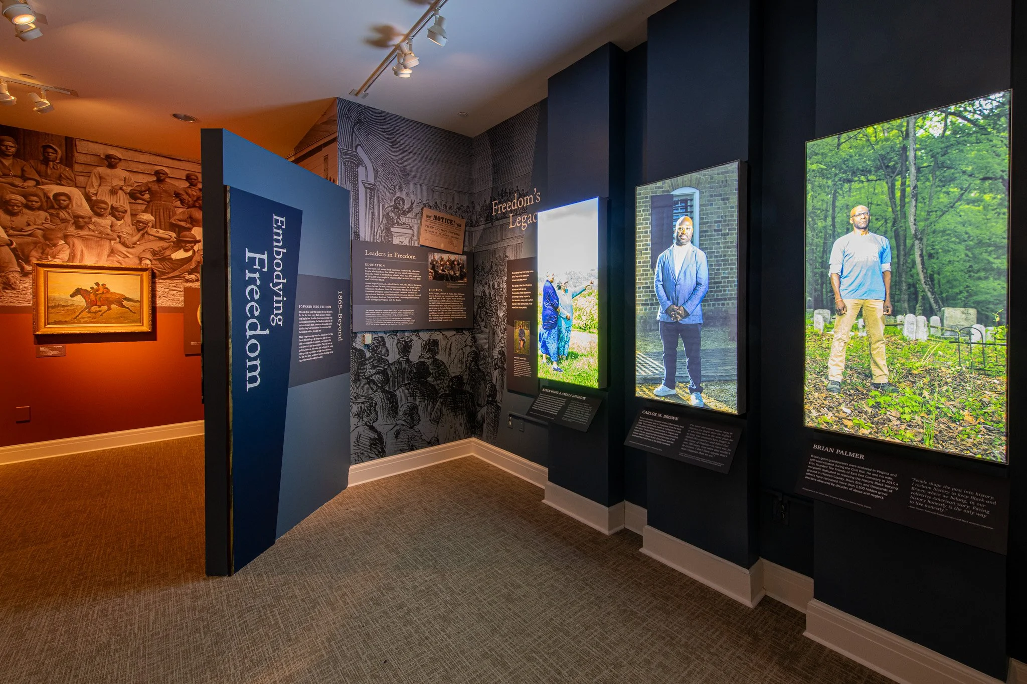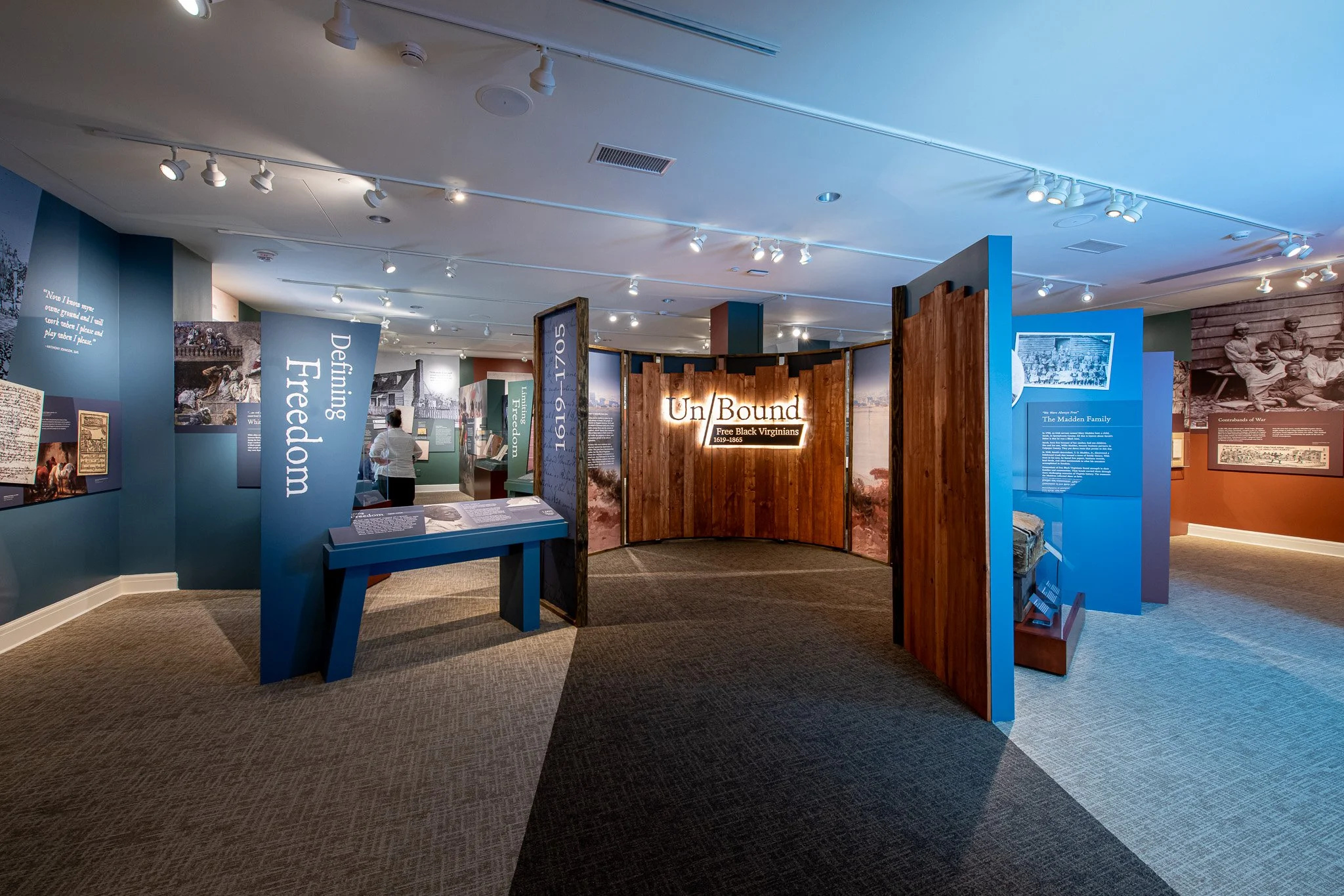 The design highlights the complex journey between slavery and freedom. Visitors enter through a central introduction featuring a backlit title and an immersive panoramic painting. From this hub, exhibition sections radiate outward, guiding visitors through the narrative while offering glimpses of what lies ahead. A rich, varied color palette distinguishes each section, while large-scale graphics and document enlargements provide immersive context and tactile visual texture, inviting visitors to engage deeply with the stories on display.