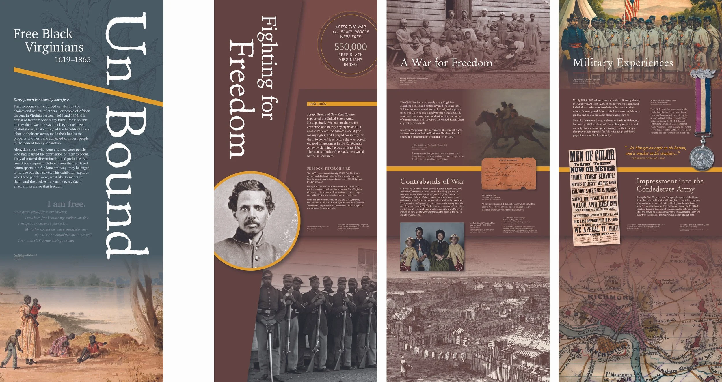 Un/Bound: Free Black Virginians, 1619–1865 brings together artifacts and compelling stories from across Virginia to explore the lives of free Black Virginians. From the arrival of the first captive Africans in 1619 to the abolition of slavery in 1865, the exhibition reveals how these individuals claimed their freedom, built communities, and navigated a legal system that recognized them as free but not equal.