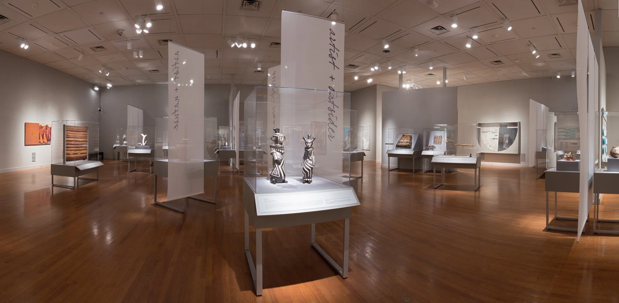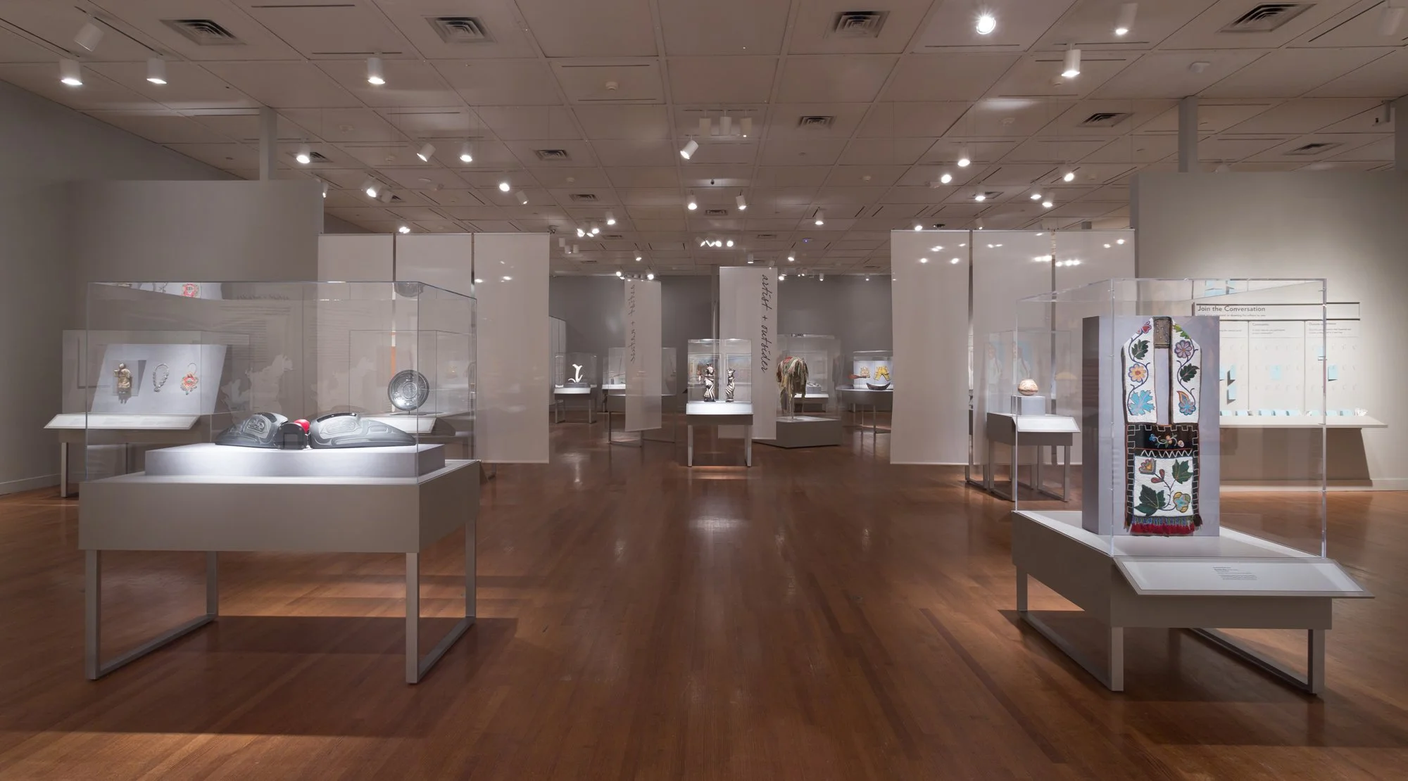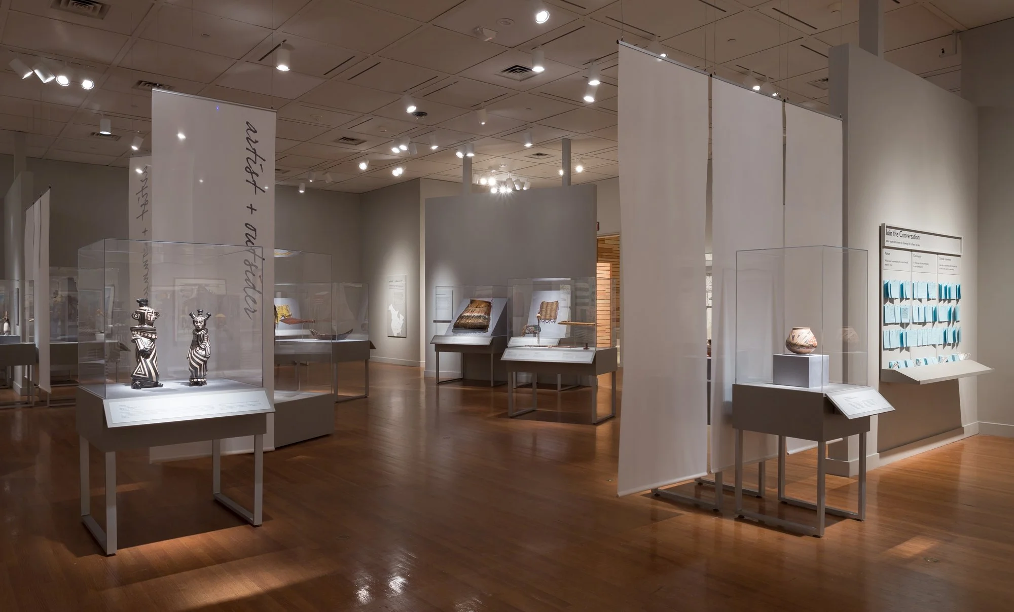 The exhibition is organized around three interrelated themes—Artist and Community, Artist and Nature, and Artist and Outsider—within an open layout that intentionally blurs boundaries between sections. Transparent fabric scrim panels act as spatial dividers and graphic surfaces, creating layered views that suggest the simultaneous presence of past, present, and future. A neutral gray palette allows the natural tones of the artwork to take prominence, while integrated audio elements create intimate moments of reflection. Lightweight, modular vitrines and easily removable scrim panels support flexibility and ease of transport, enabling Hear My Voice to travel from the Virginia Museum of Fine Arts to the Taubman Museum of Art.